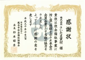 越谷市社会福祉協議会協議会様から感謝状を頂きました